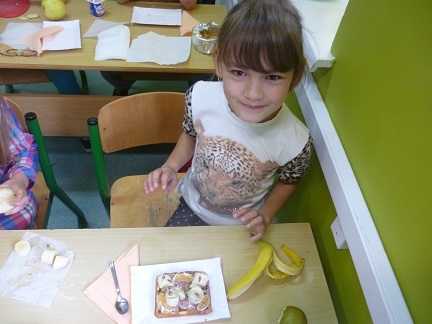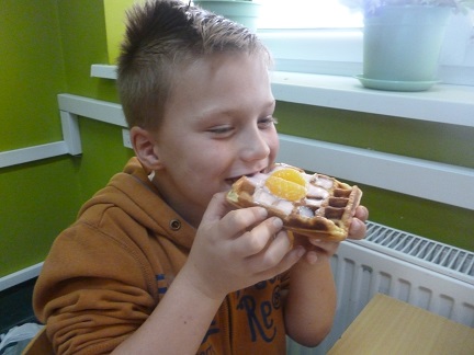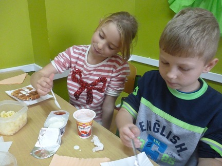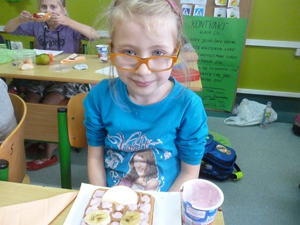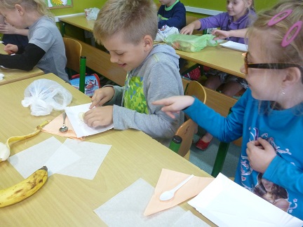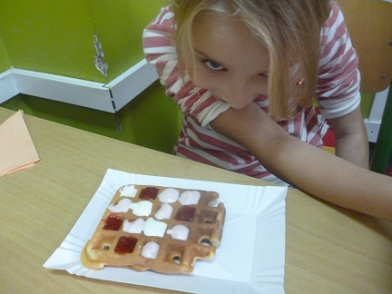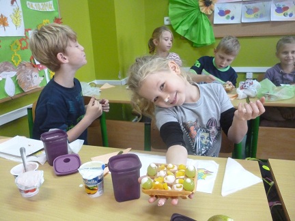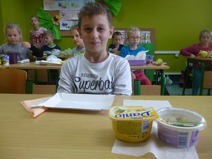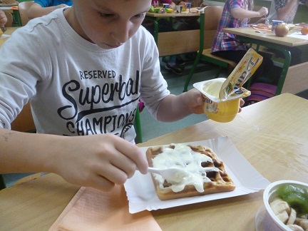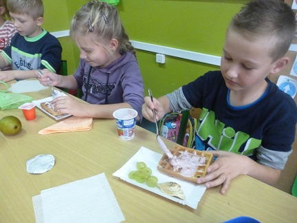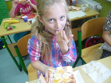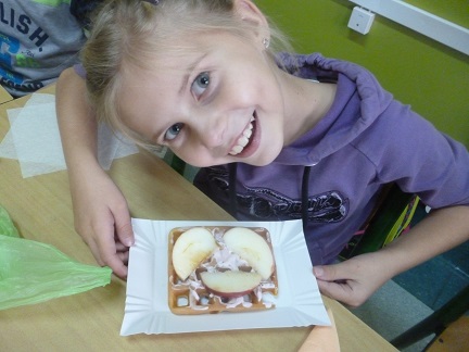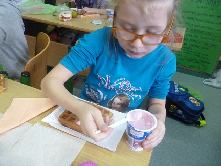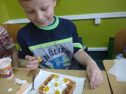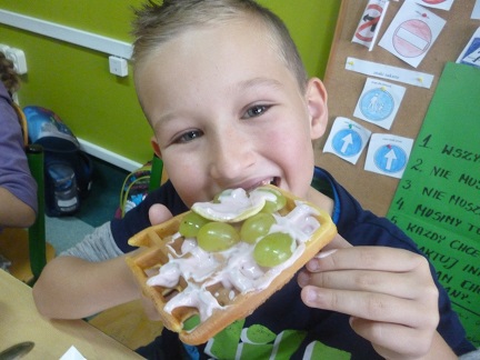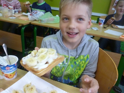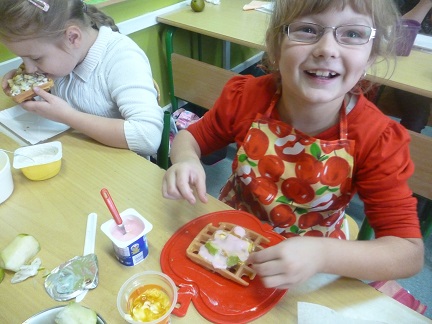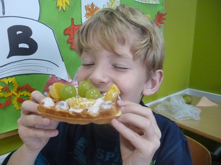 W październiku klasa IIb przypominając sobie wiadomości o zdrowym żywieniu przygotowała owocowe gofry z jogurtem. Było bardzo smacznie i wesoło, ale przede wszystkim zdrowo :)