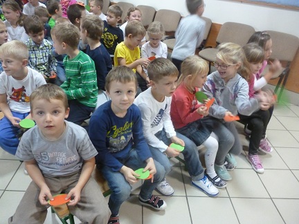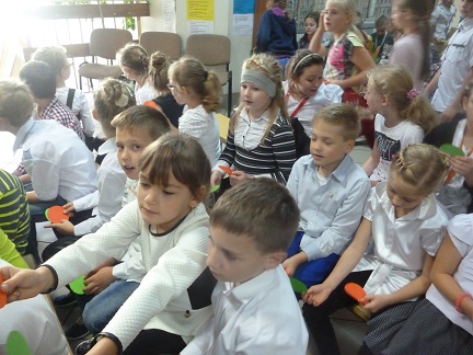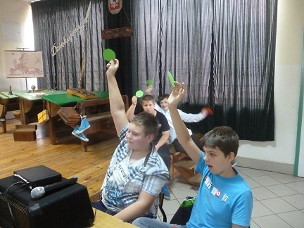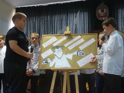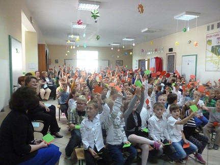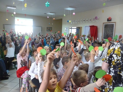 Po części artystycznej pani Małgorzata Zdunek zaprosiła wszystkich uczniów do quizu na temat znajomości pracowników SP w Gołuchowie. dzieci miały za zadanie odpowiadać zielono czerwonymi "światełkami". Wykazały się przy tym ogromna wiedza :)