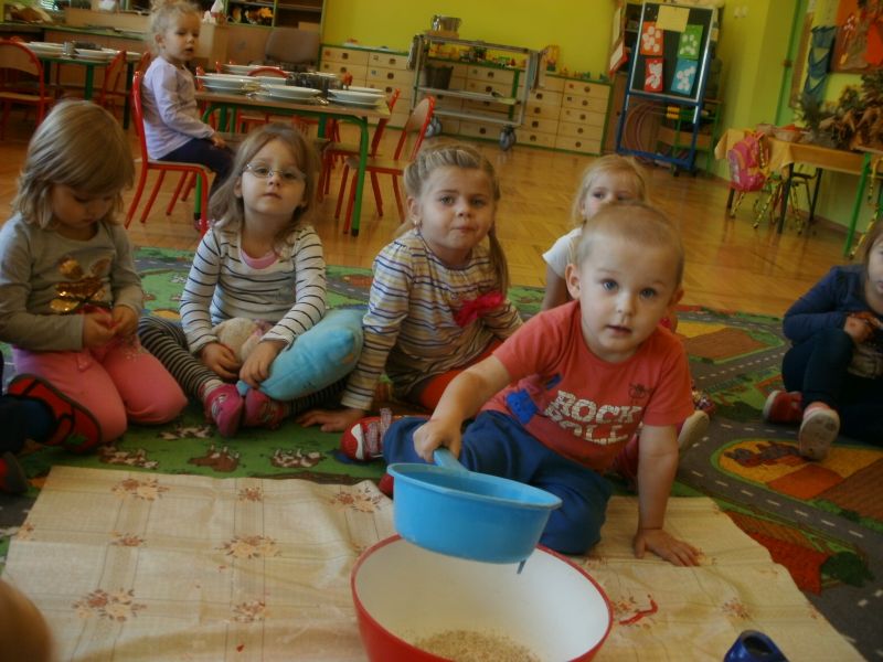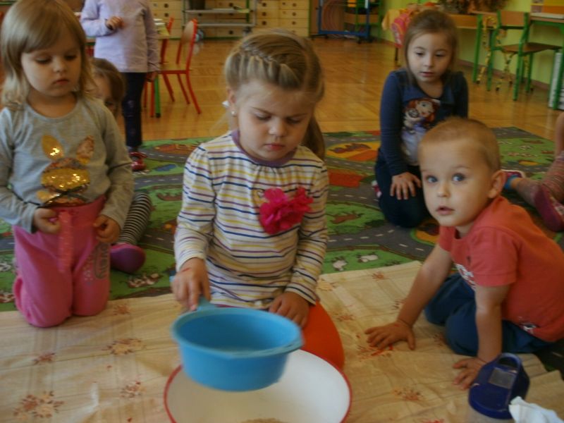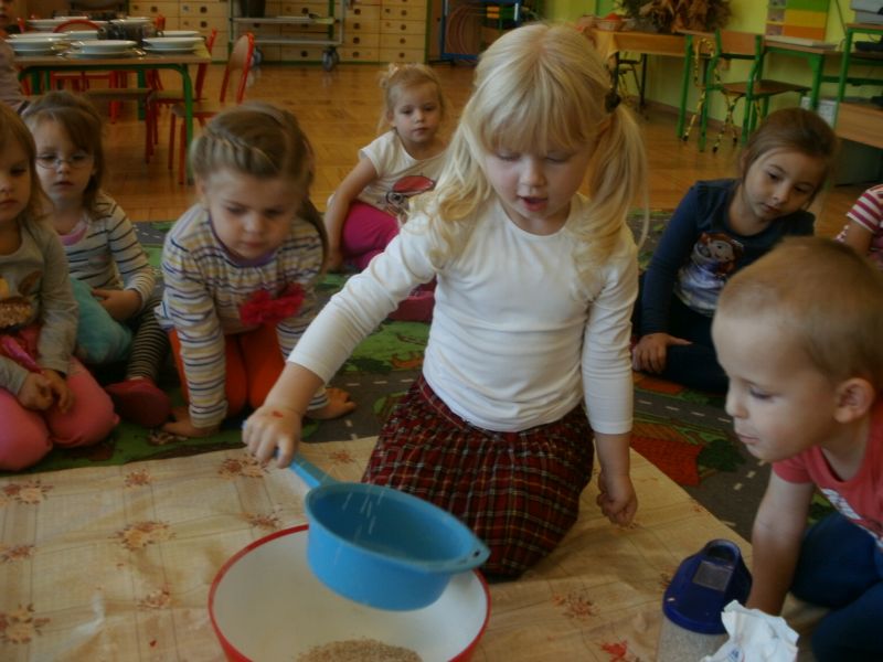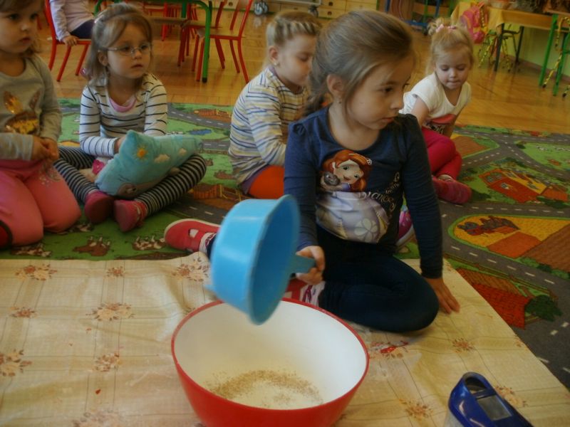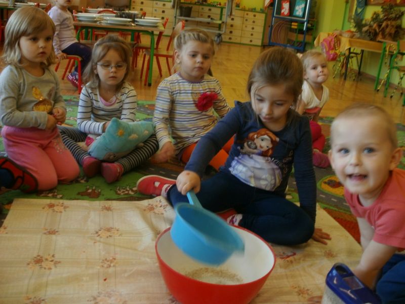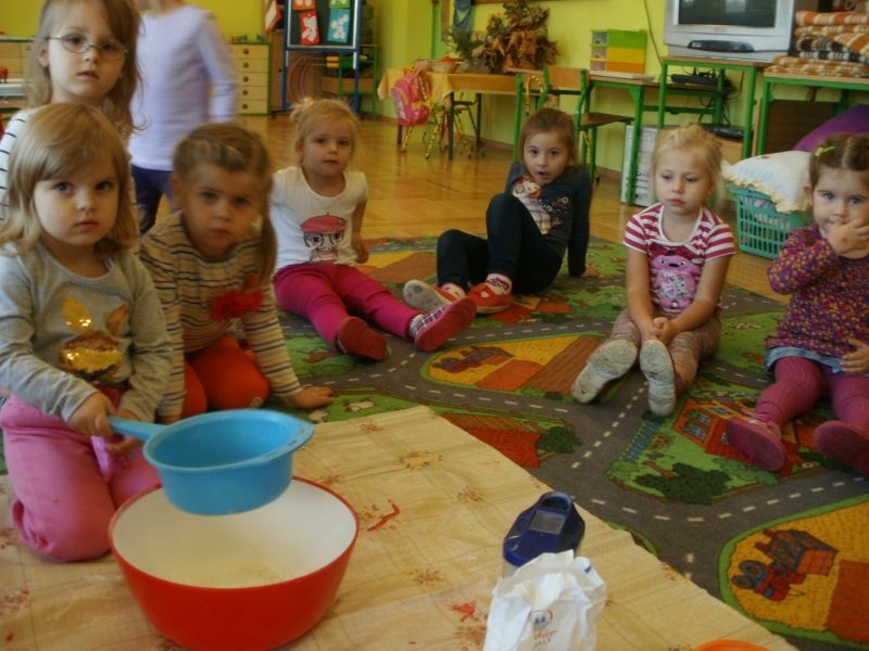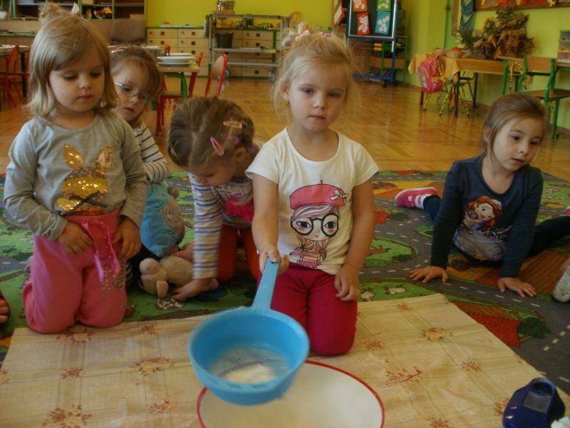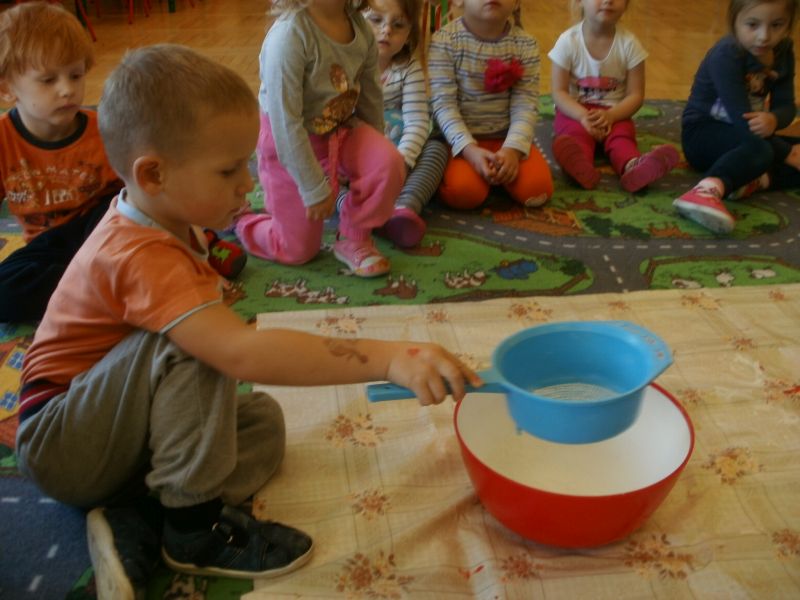 Dziś Rybki miały okazję podoświadczać! Sami przeprowadzali eksperymenty na produktach spożywczych. Sprawdzali, co można przesiać przez sito. Dowiedzieli się również, jakie składniki są potrzebne do zrobienia ciasta.