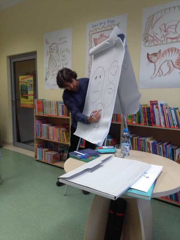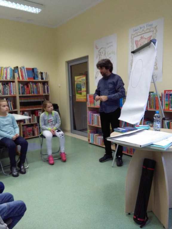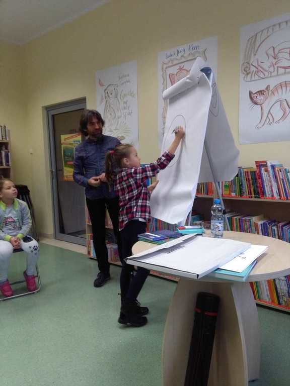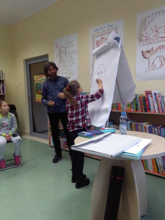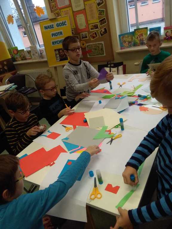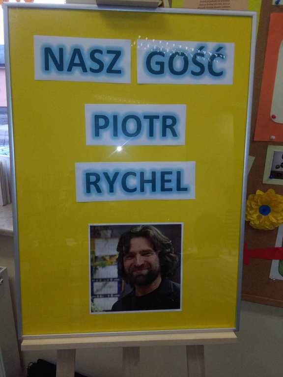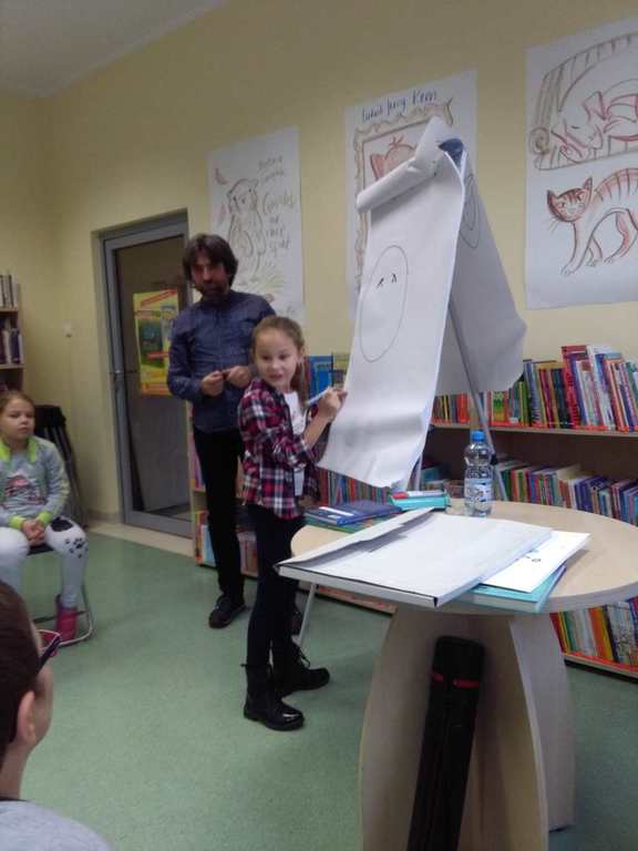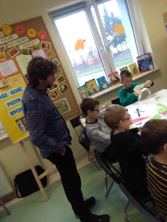 W dniu 24 października uczniowie klasy IIIa spotkali się z grafikiem Piotrem Rychlem. Spotkanie zorganizowała pani Kaja Król - Brandyk z Biblioteki Publicznej. Pan Piotr opowiedział dzieciom, w jaki sposób tworzy ilustracje do książek oraz stworzył mini warsztaty ilustratorskie. Każdy mógł wykonać okładkę do swojej książki. Powstały piękne i twórcze prace.