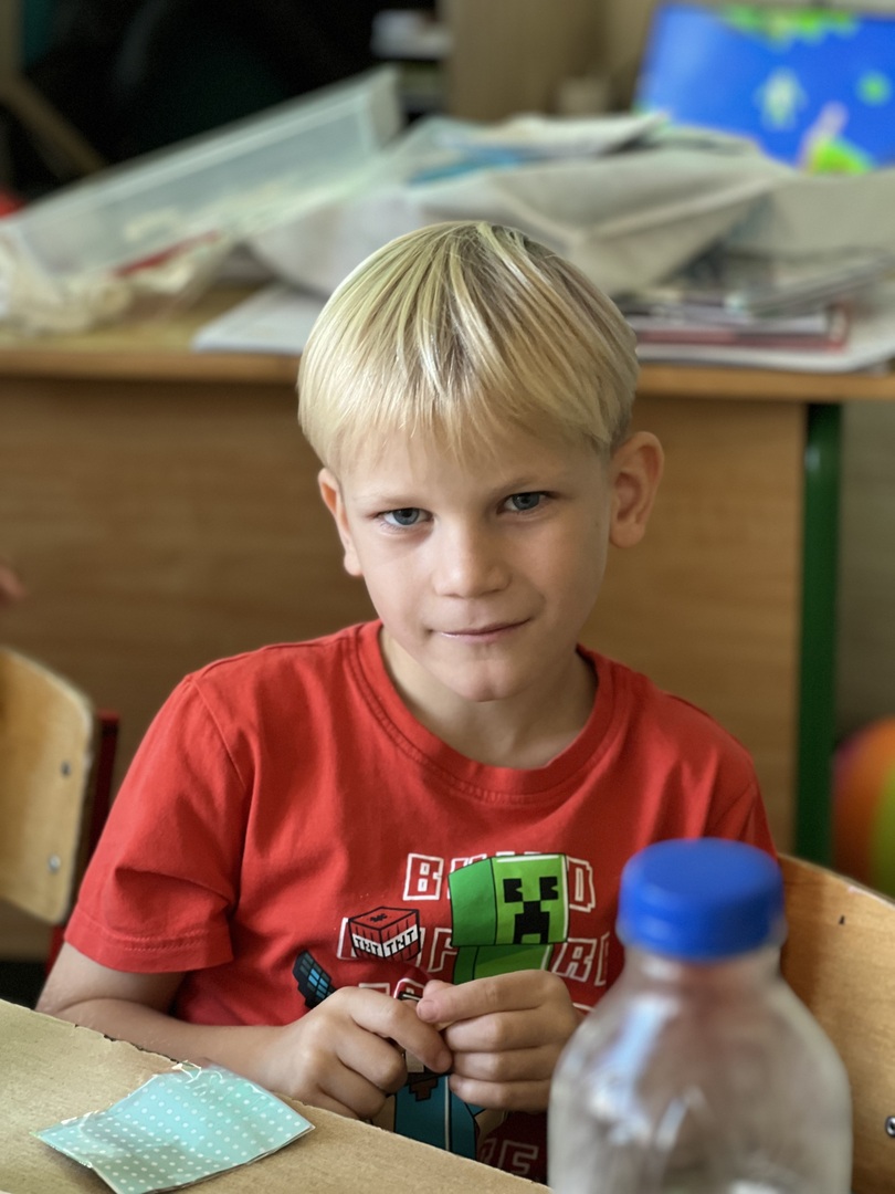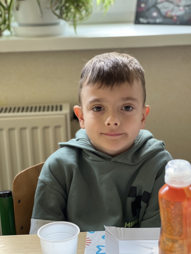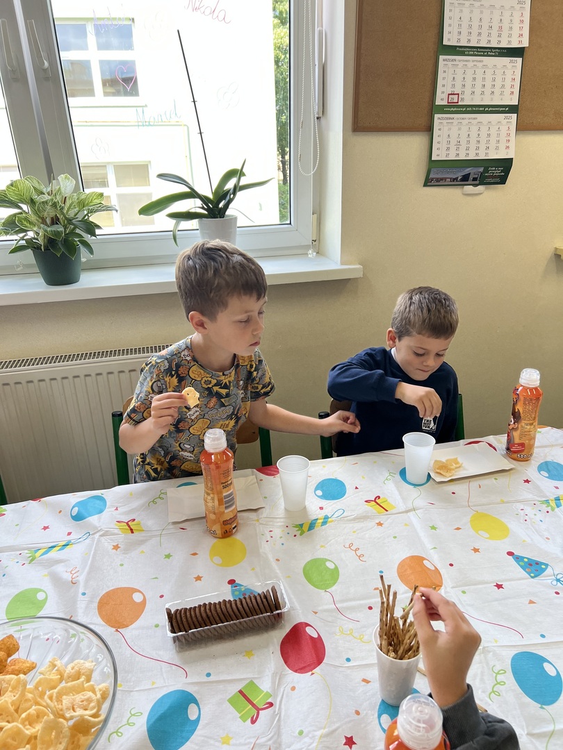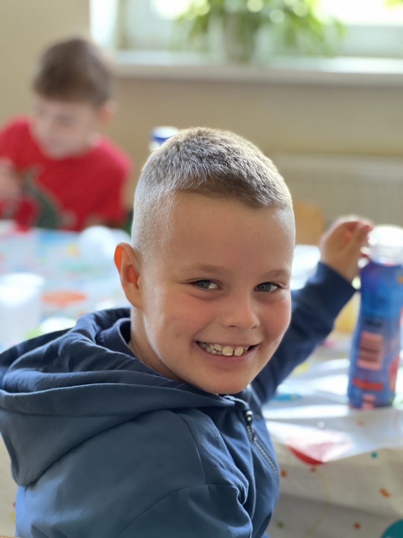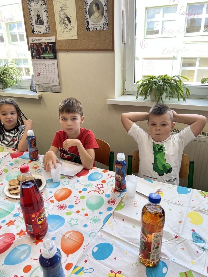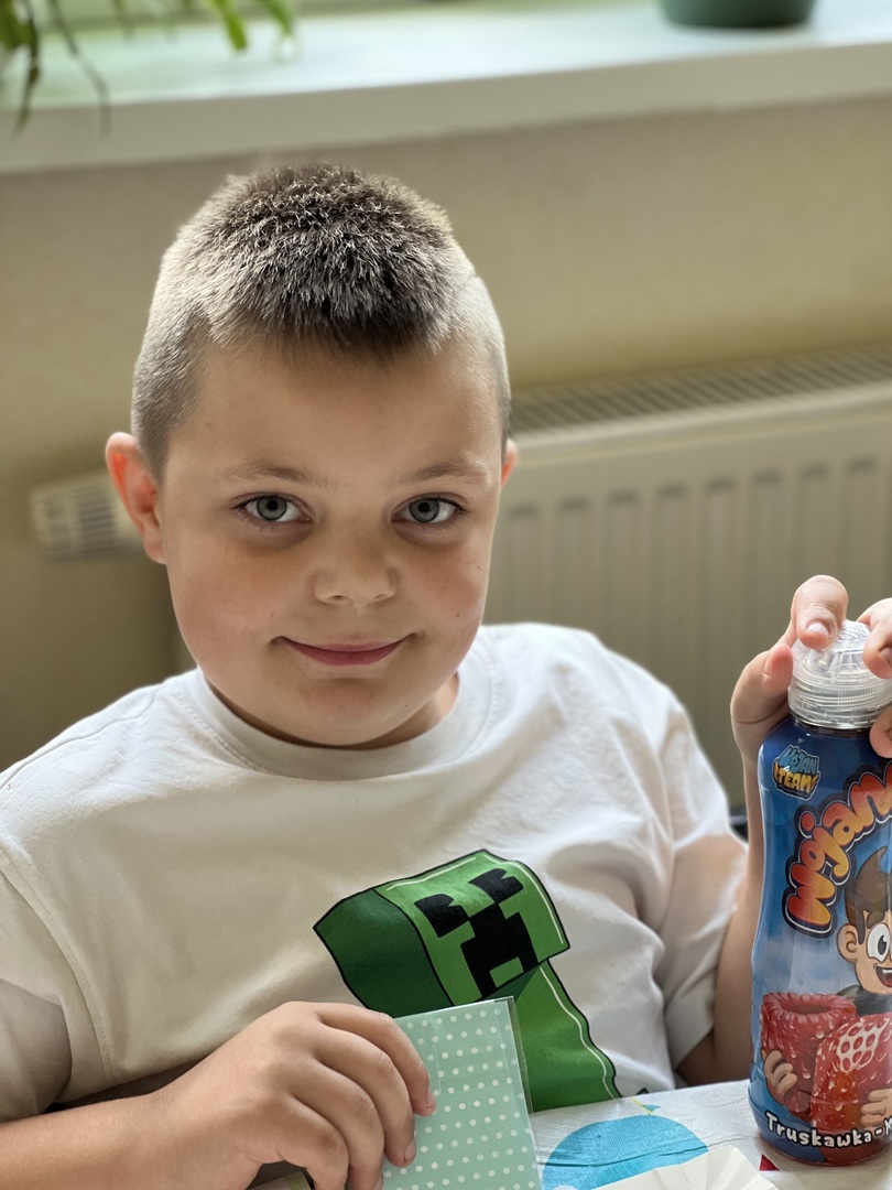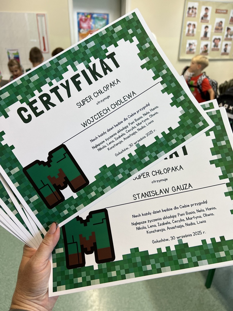 Na chłopców czekał pyszny poczęstunek, wspólne gry i zabawy 🎈 oraz wyjątkowe atrakcje. Każdy z trzynastu chłopaków otrzymał certyfikat Super Chłopaka w klimacie Minecraft. Była też fotobudka, dzięki której mogliśmy zrobić zabawne zdjęcie na pamiątkę. Nawet pani Basia zadbała o minecraftowy akcent i przyszła w bluzie z motywem tej gry.