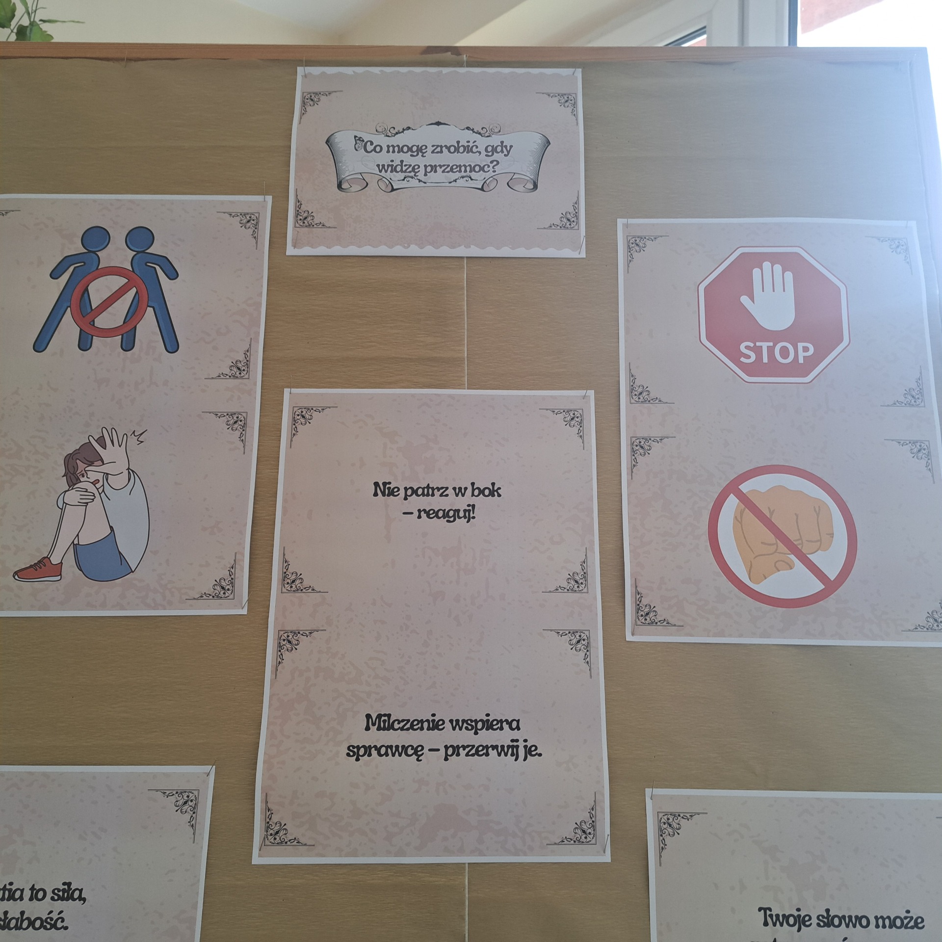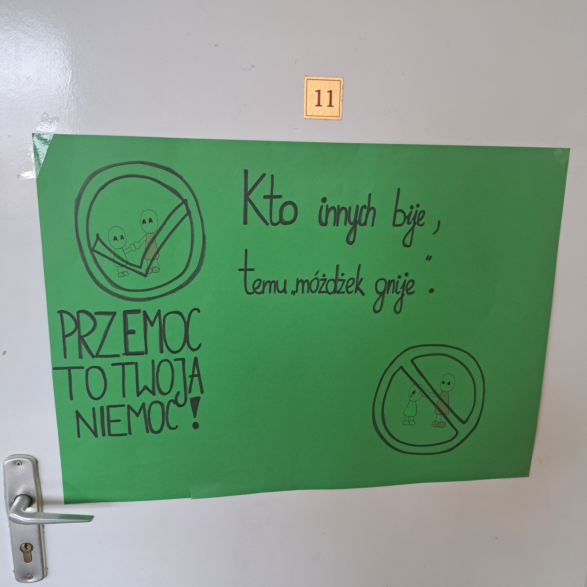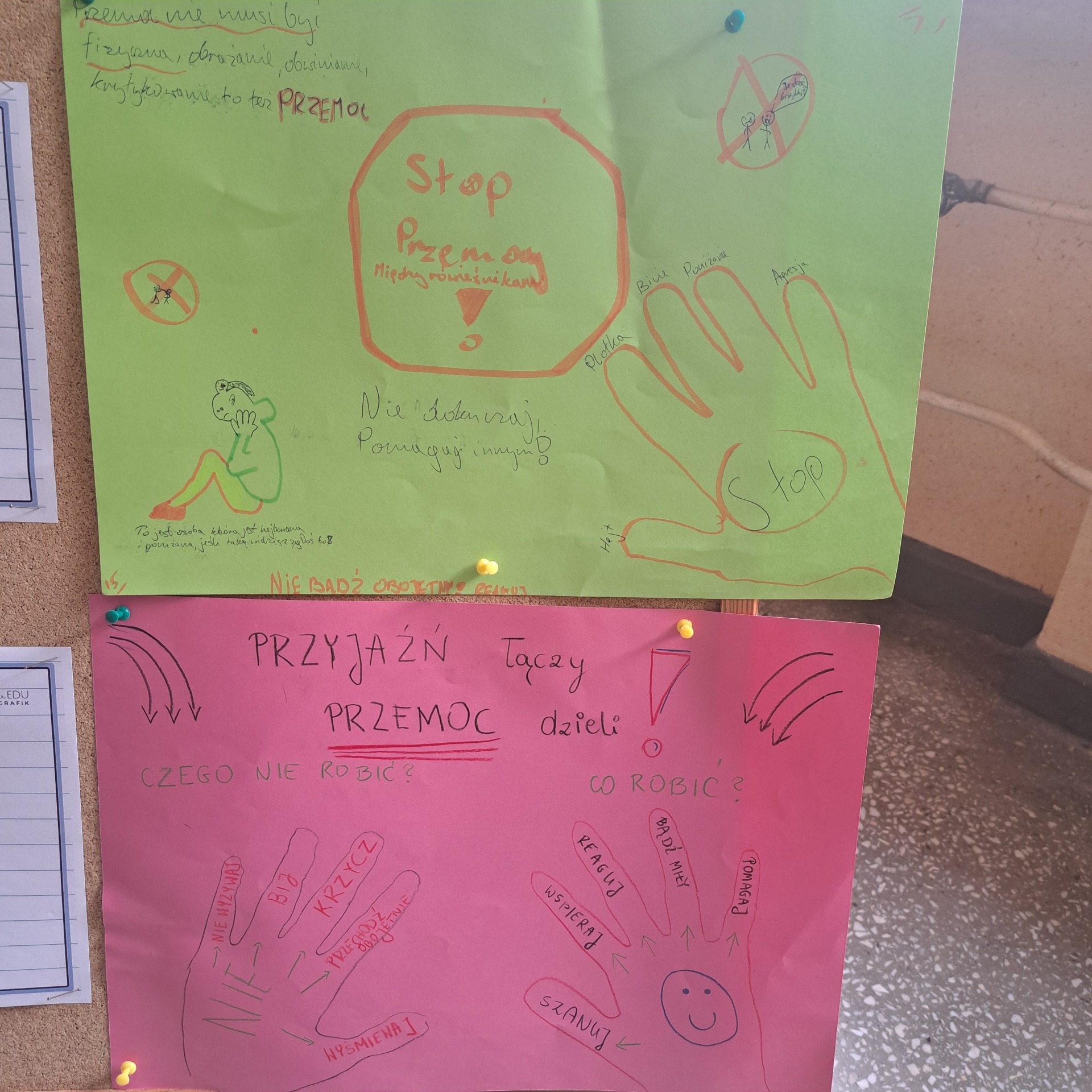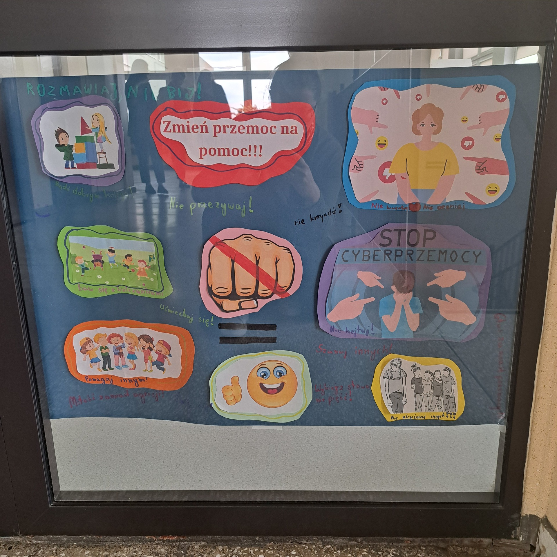 Uczniowie klas 4-8 przygotowali plakaty z hasłami związanymi z przeciwdziałaniem przemocy, które umieścili na drzwiach swoich sal lekcyjnych, można je podziwiać na załączonych fotografiach. Na gazetkach pojawiły się tematyczne informacje i ciekawostki związane z tematem przeciwdziałania przemocy rówieśniczej.