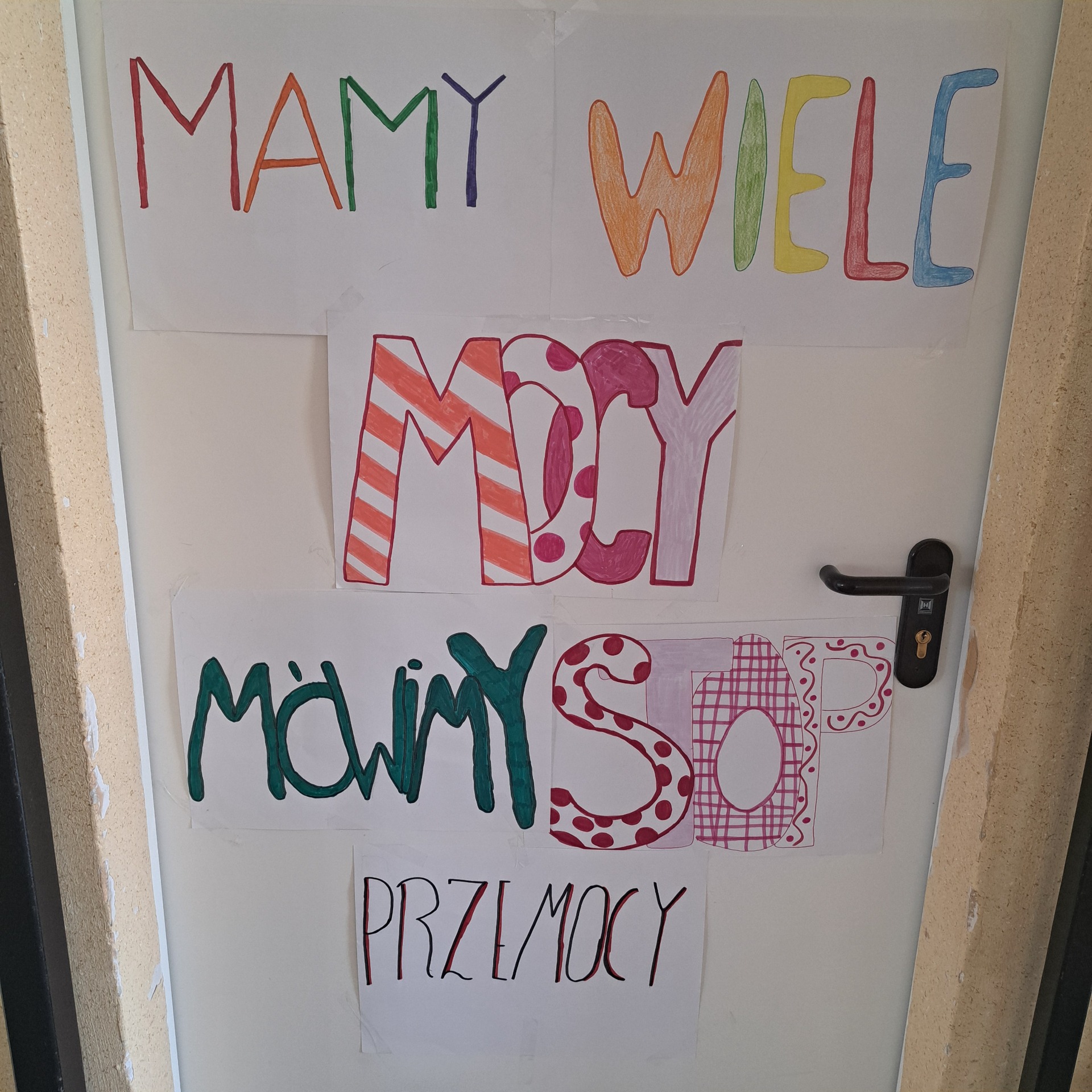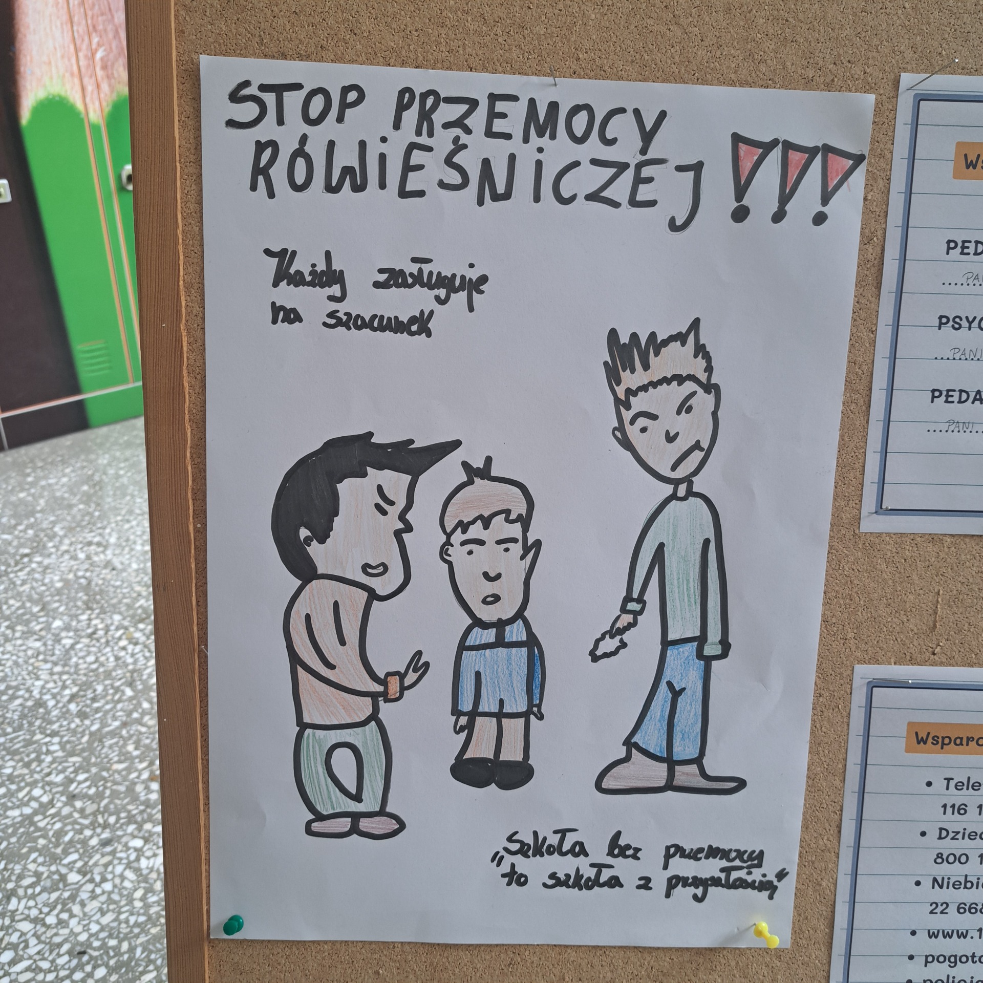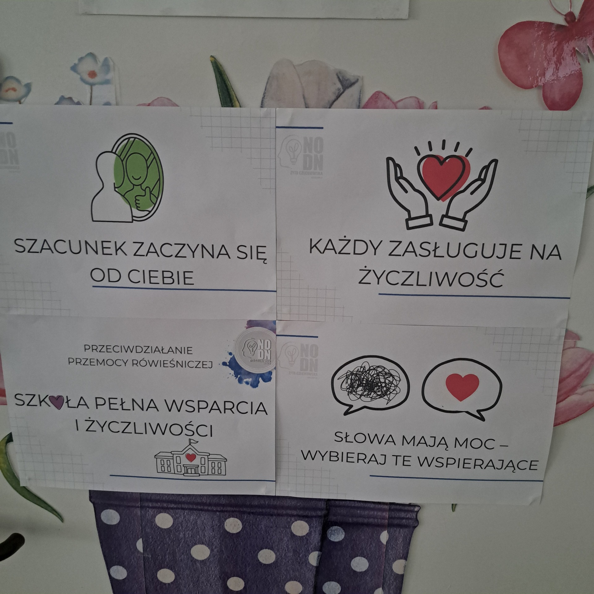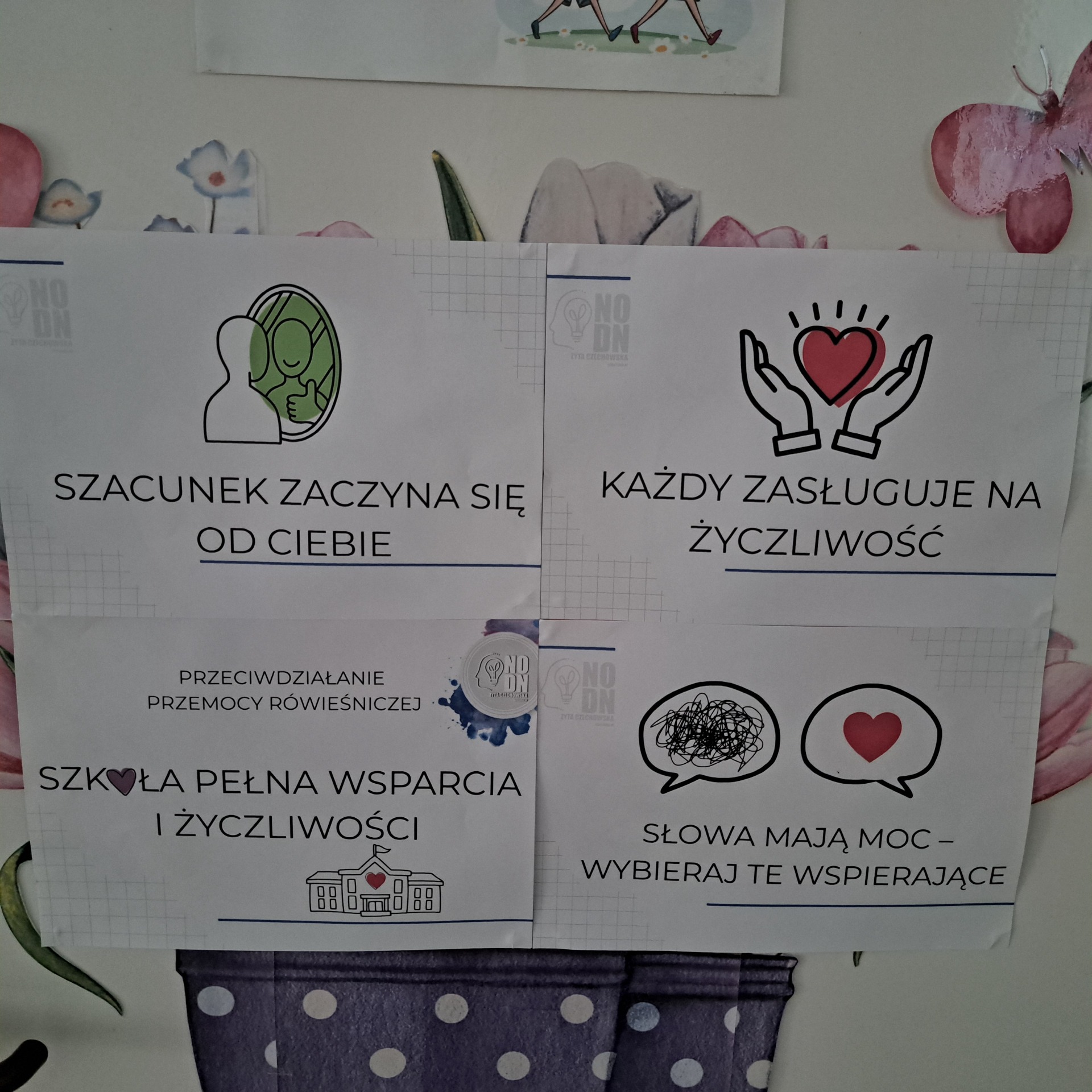 Uczniowie klas 4-8 przygotowali plakaty z hasłami związanymi z przeciwdziałaniem przemocy, które umieścili na drzwiach swoich sal lekcyjnych, można je podziwiać na załączonych fotografiach. Na gazetkach pojawiły się tematyczne informacje i ciekawostki związane z tematem przeciwdziałania przemocy rówieśniczej.