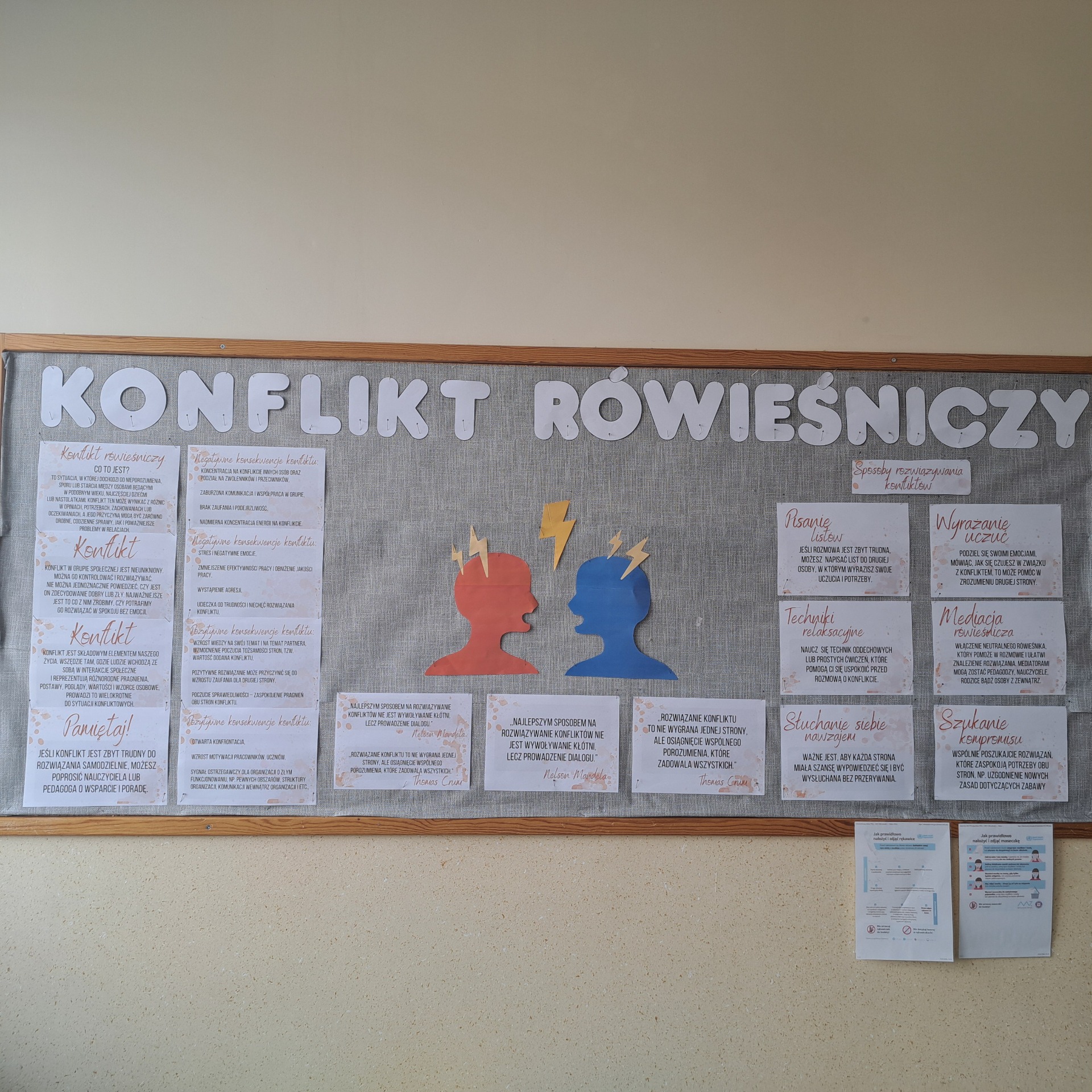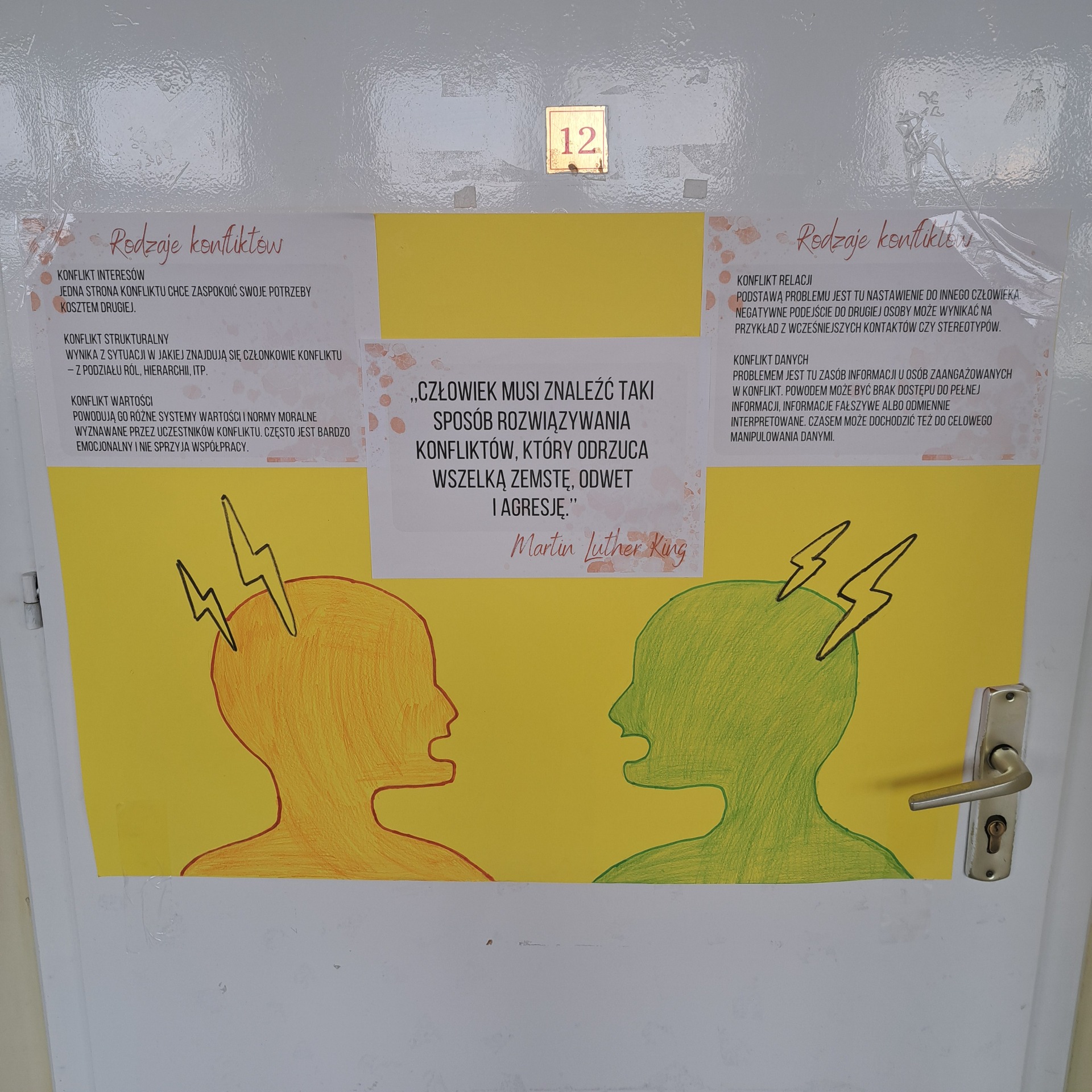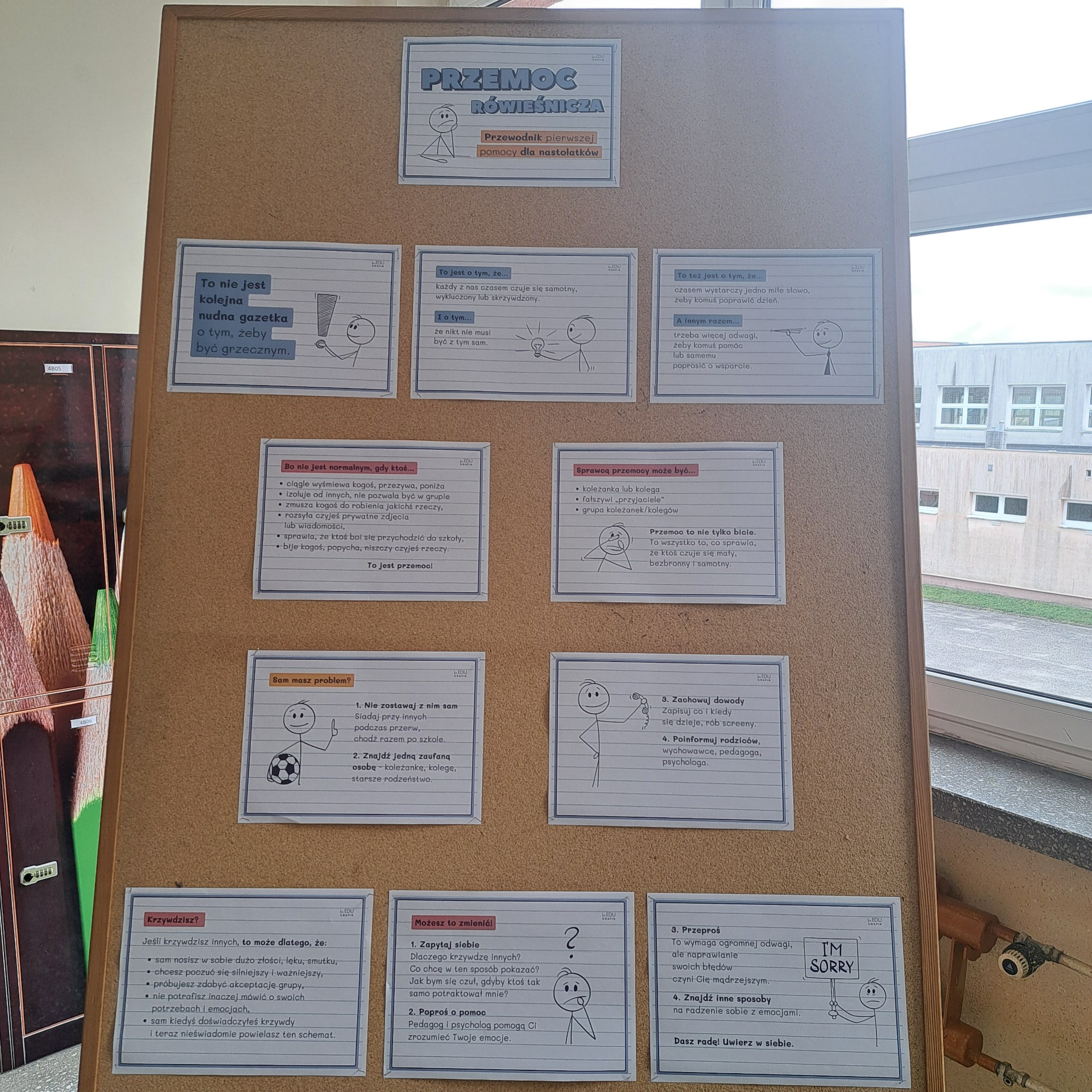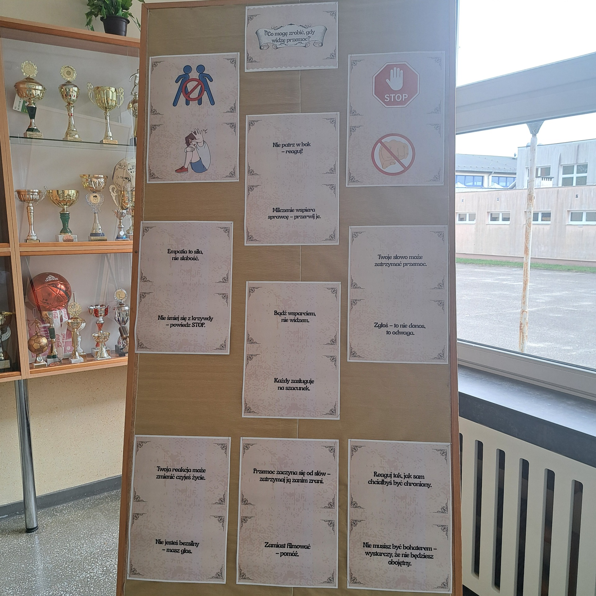 Uczniowie klas 4-8 przygotowali plakaty z hasłami związanymi z przeciwdziałaniem przemocy, które umieścili na drzwiach swoich sal lekcyjnych, można je podziwiać na załączonych fotografiach. Na gazetkach pojawiły się tematyczne informacje i ciekawostki związane z tematem przeciwdziałania przemocy rówieśniczej.