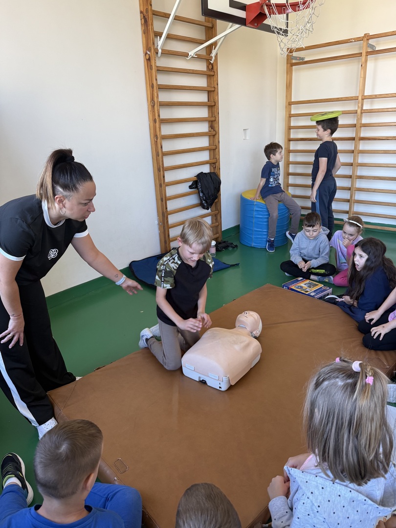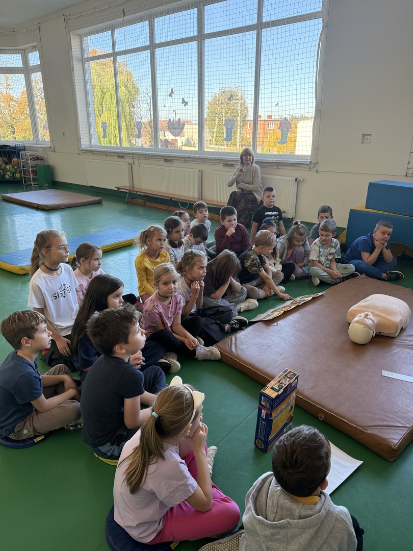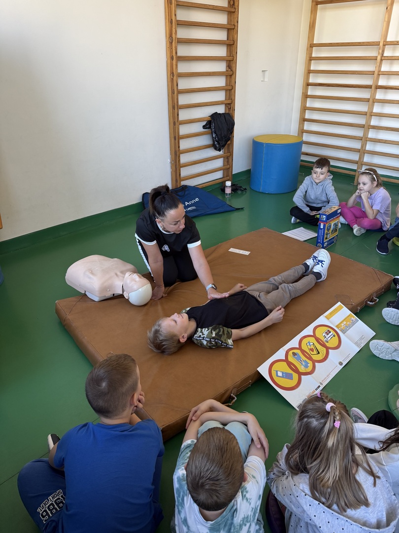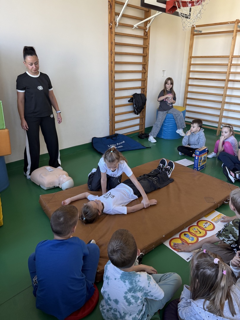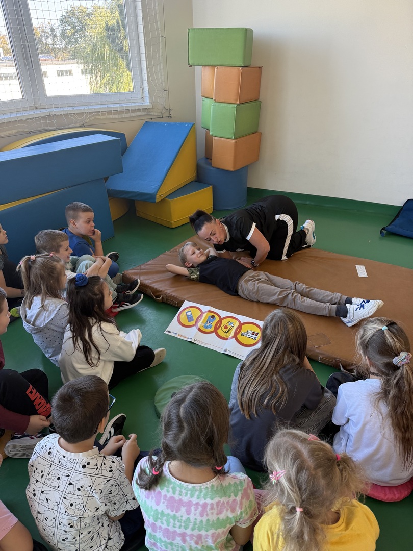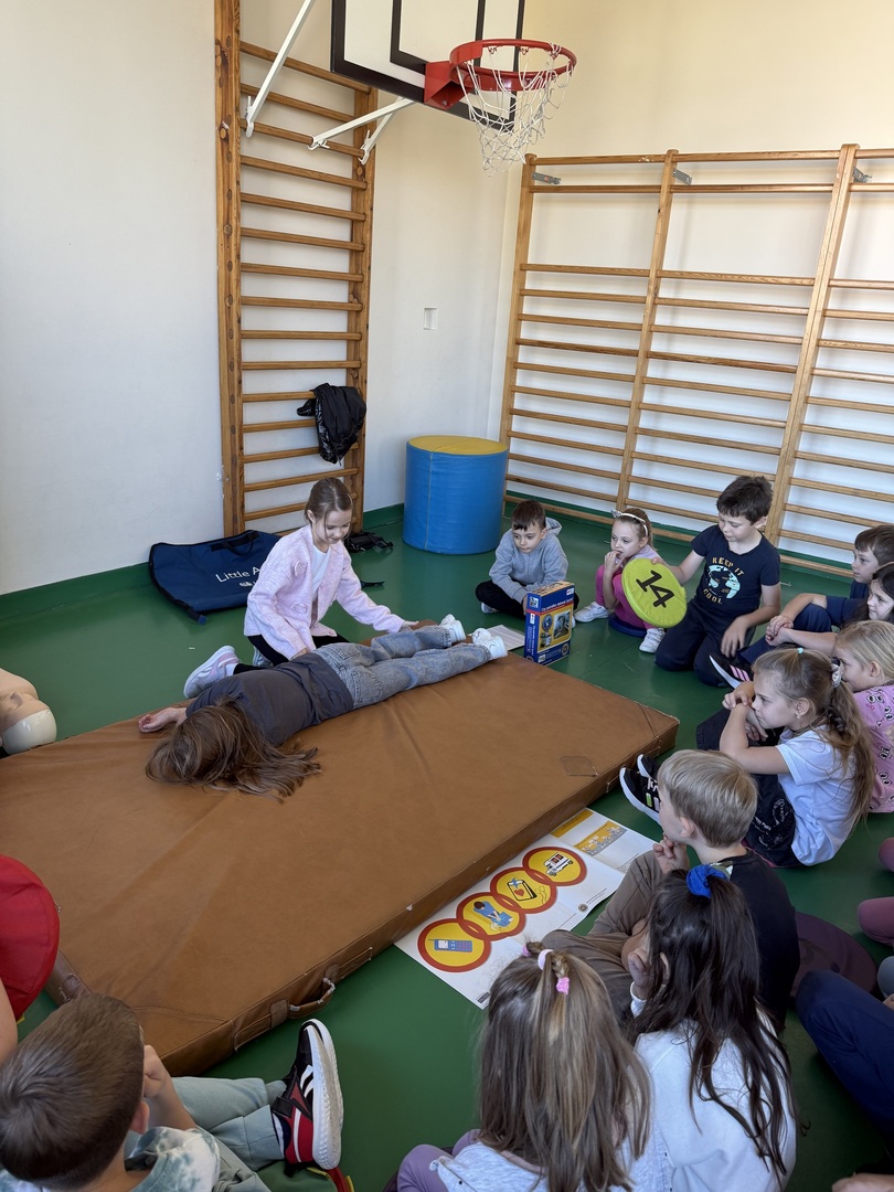 Dzieci uczyły się, jak wezwać pomoc 🚑, sprawdzić przytomność, a także jak zadbać o bezpieczeństwo własne i poszkodowanego.