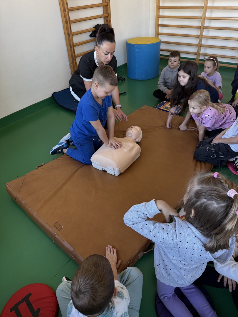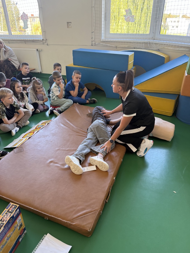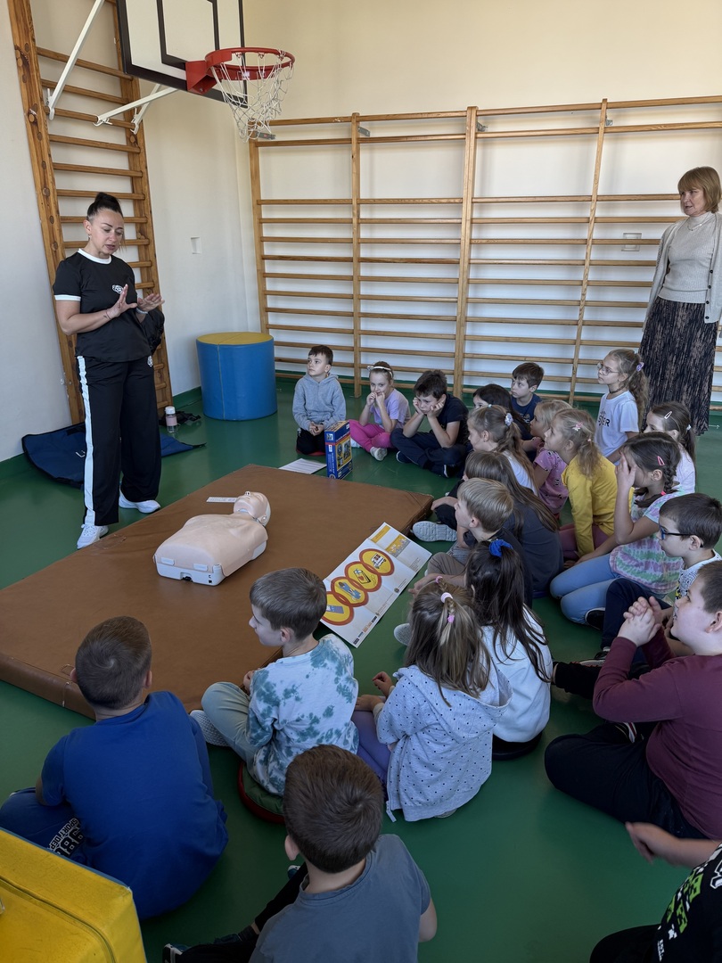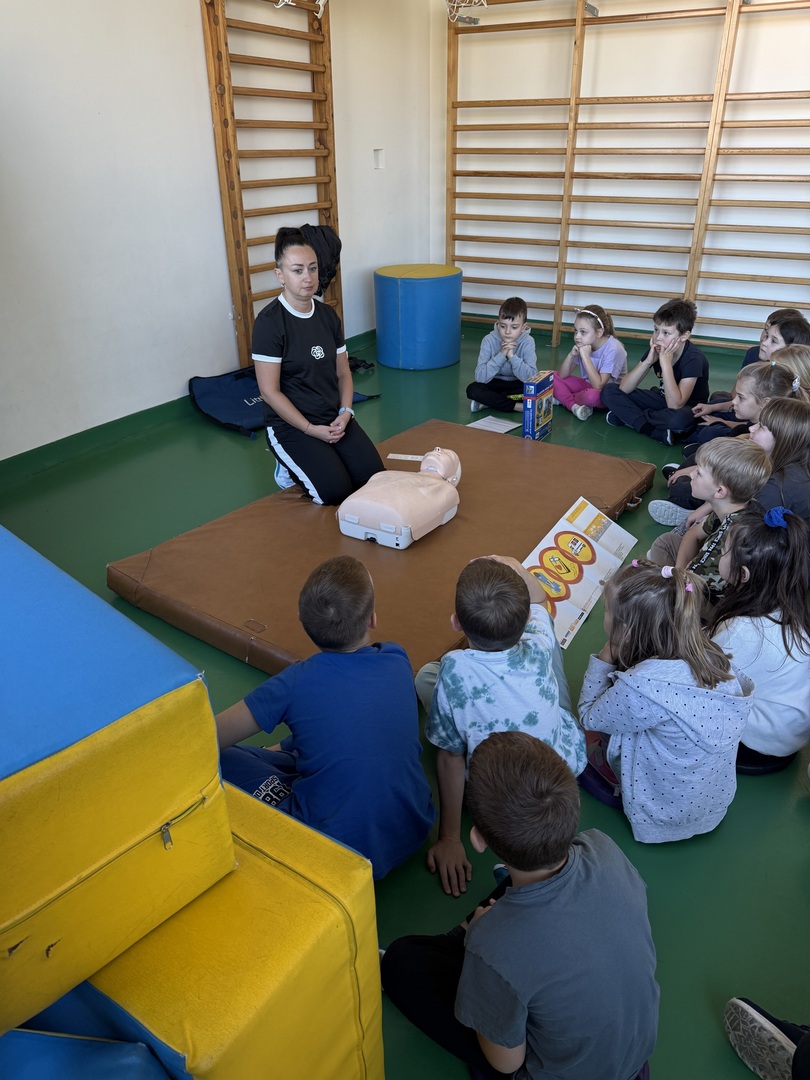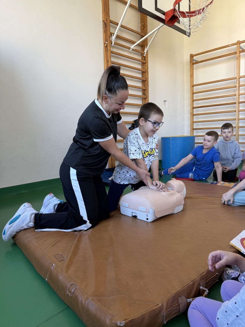 Dzieci uczyły się, jak wezwać pomoc 🚑, sprawdzić przytomność, a także jak zadbać o bezpieczeństwo własne i poszkodowanego.