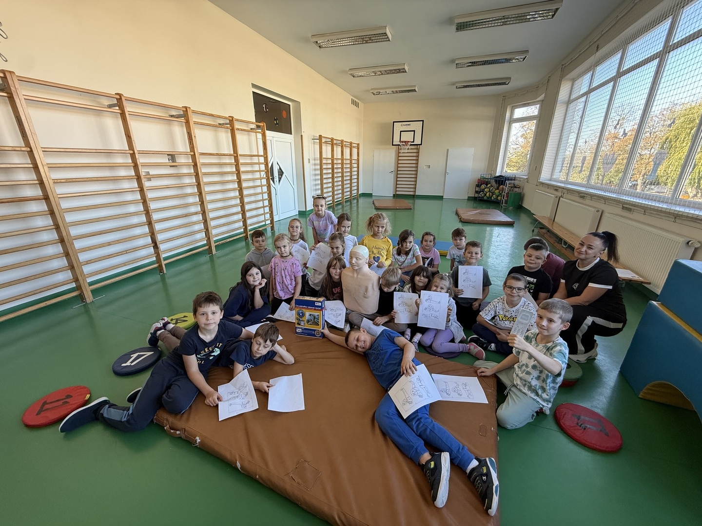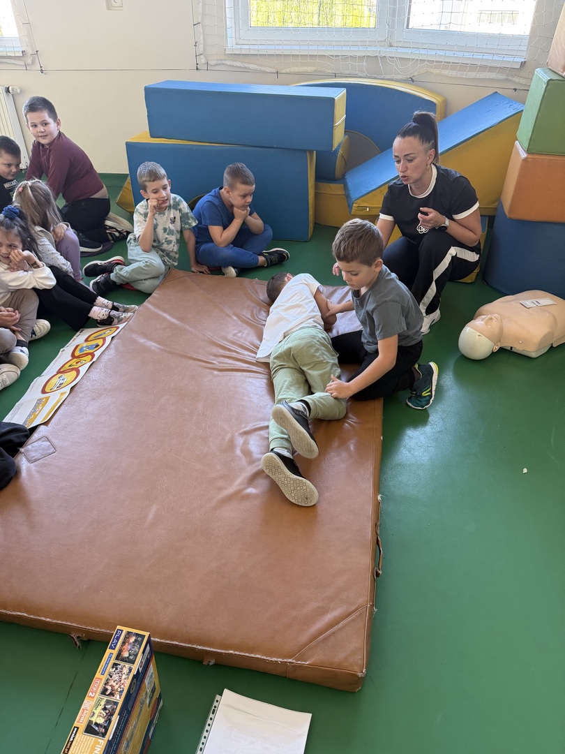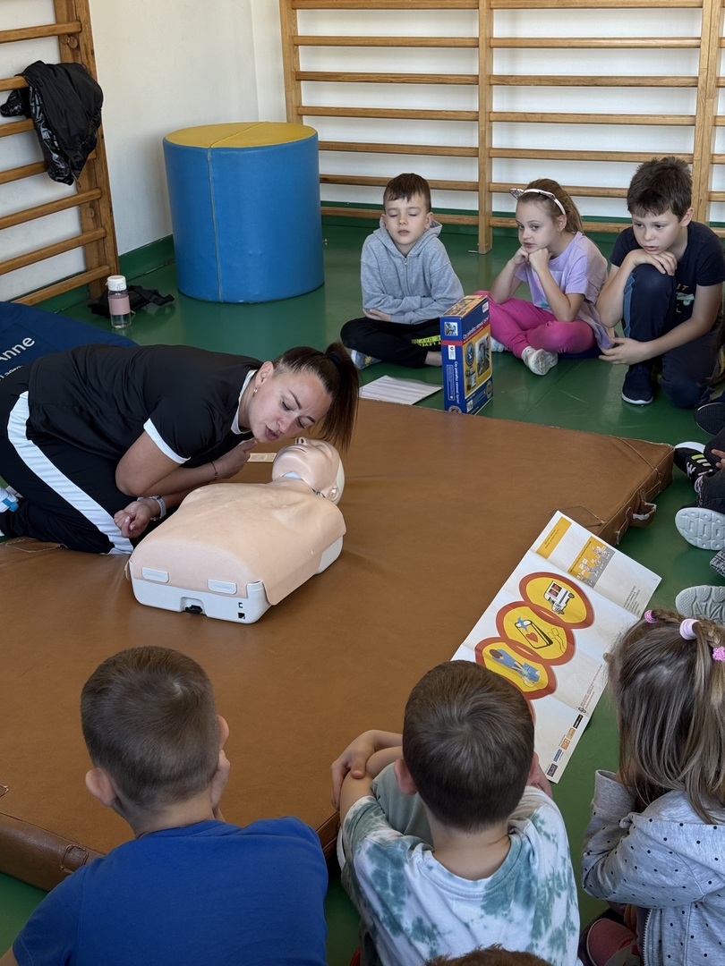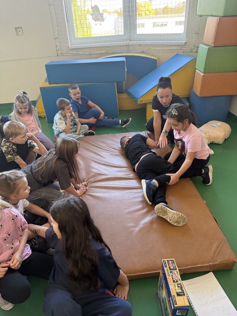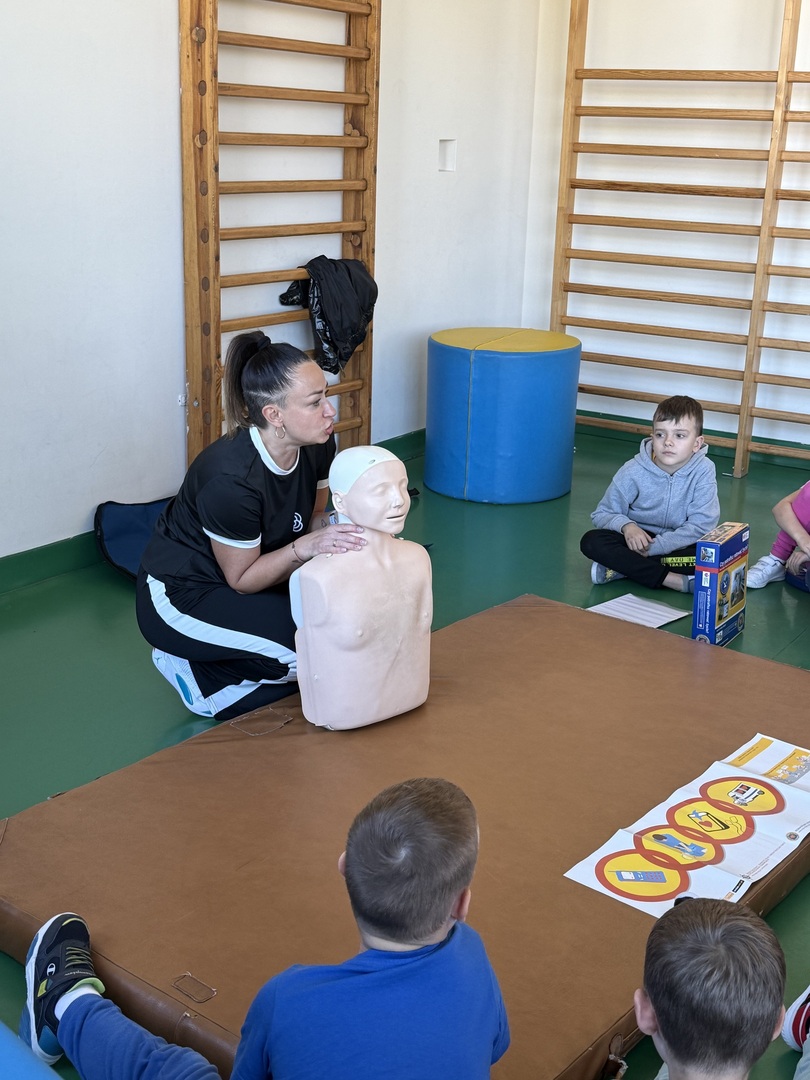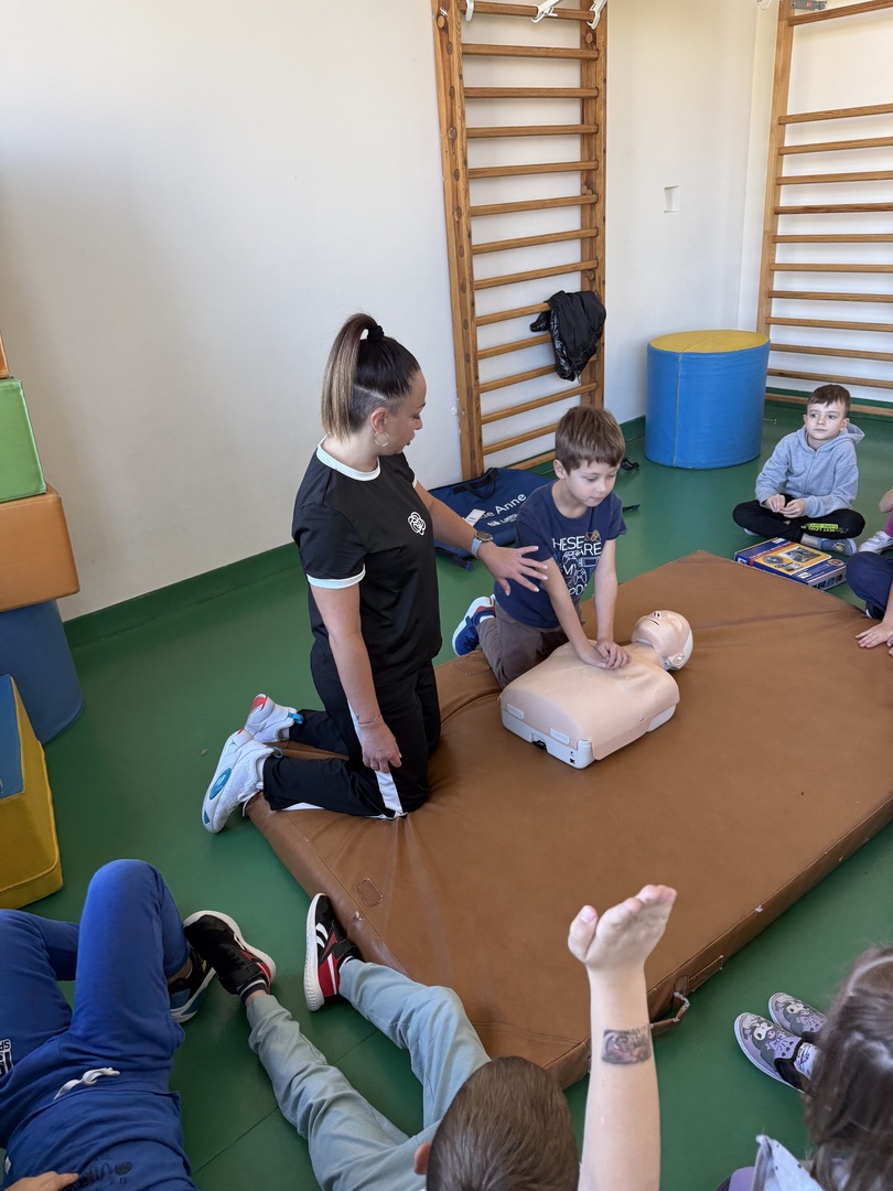 Dzieci uczyły się, jak wezwać pomoc 🚑, sprawdzić przytomność, a także jak zadbać o bezpieczeństwo własne i poszkodowanego.
